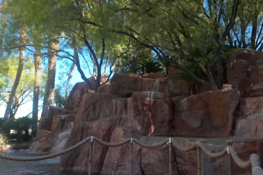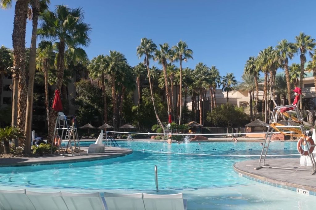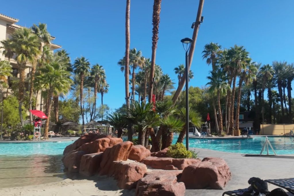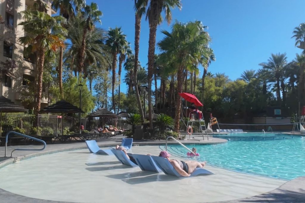 The lazy river wraps through a landscaped tropical-style pool area with palm trees, waterfalls, and that resort soundtrack in the background. It doesn’t feel like Vegas. It feels like you accidentally booked a Caribbean timeshare.